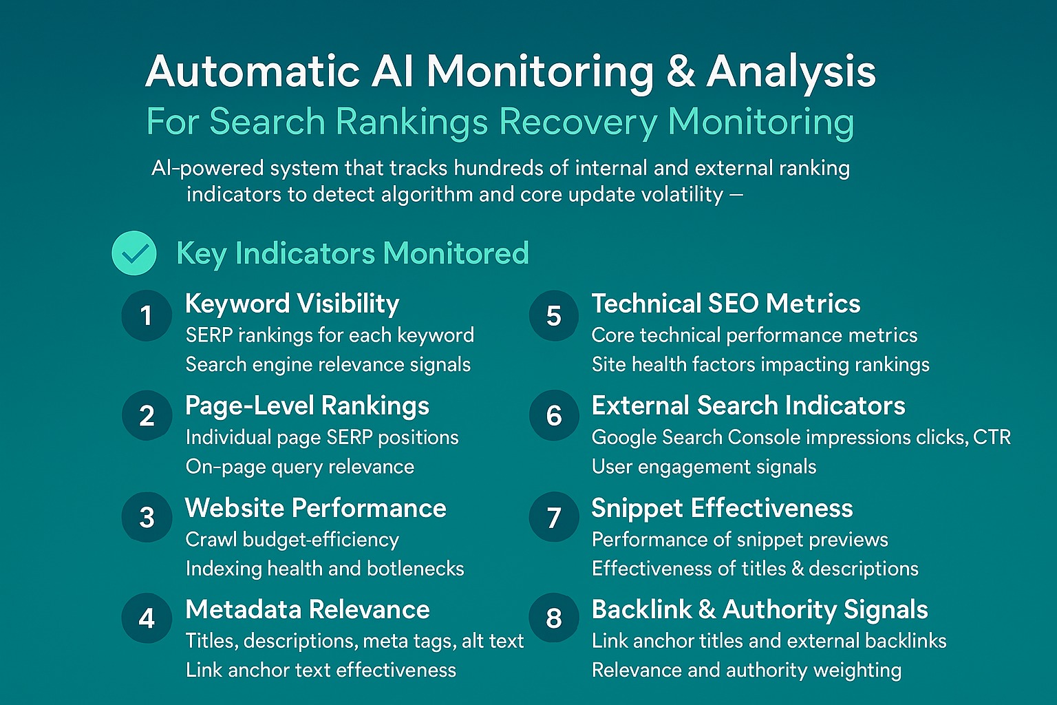 It’s important to note that advanced systems like NytroSEO don’t try to decode or predict every move a search engine makes. Instead, the system reacts based on observable indicators – such as drops in rankings, changes in how relevant pages are for key search terms, or new priorities detected in search engine behaviors. These signals prompt the system to analyze, learn, and then intelligently implement updates to your website’s meta tags, structured data, and on-page signals. NytroSEO doesn’t make changes in a constant real-time stream but applies updates strategically when it matters most, after analyzing these search engine indicators and only after assessing the impact. This approach minimizes unnecessary shifts, avoids negative outcomes, and helps recover or improve search performance for all types of businesses, from SEO agencies to major publishers.