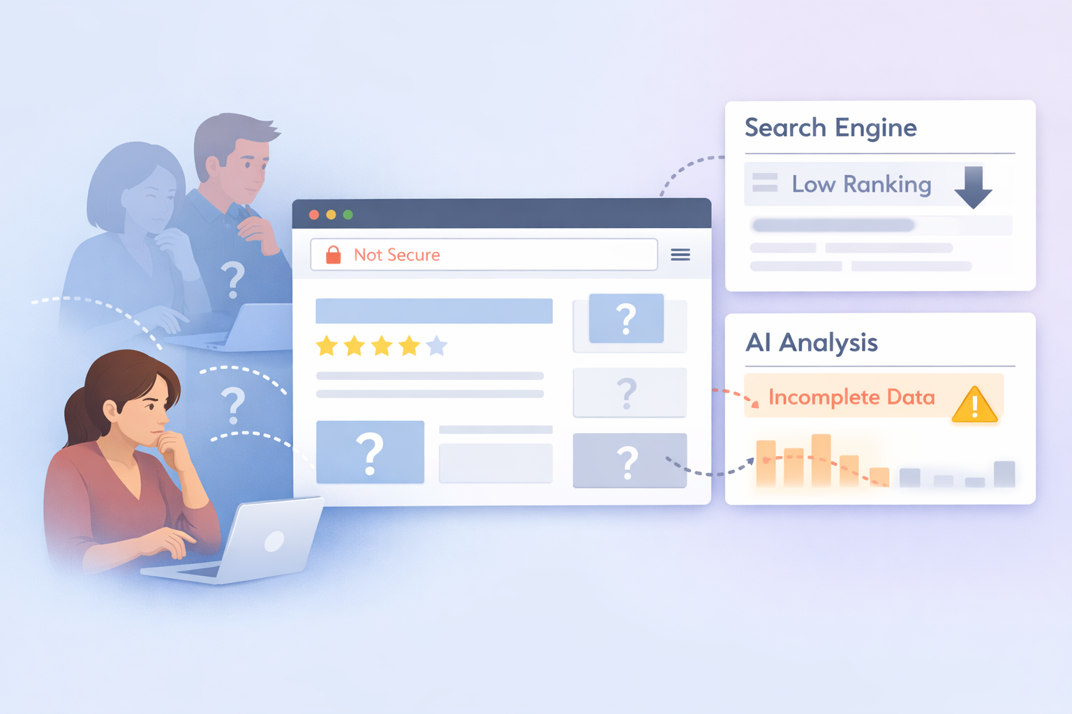If your site runs fine but feels untrustworthy, you’ll see subtle fallout: less time on page, more abandoned carts, nervous browsing, rising bounce rates, and, eventually, fewer sales. The problem compounds, as browsers and search engines amplify those same trust deficiencies to everyone else.